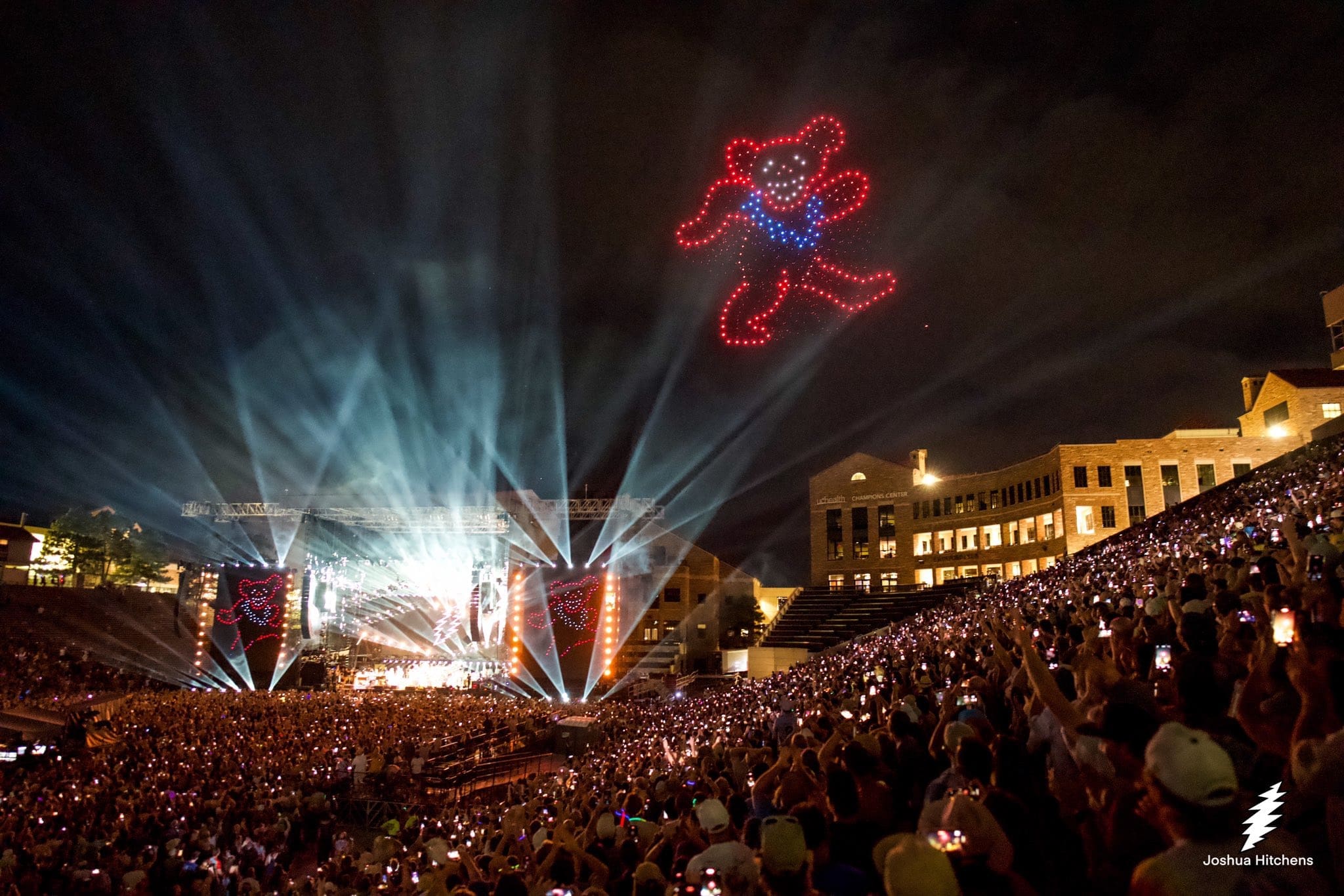 The final performance by Dead and Company at Folsom Field in Boulder featured a spectacular drone show featuring drones from Boulder based Nova Sky Stories. The performance was a testament to the band’s deep connection with the city and the enduring devotion of Colorado Deadheads. Instead of traditional 4th of July fireworks, the night sky was illuminated by a breathtaking drone display. Hundreds of twinkling blue lights formed iconic Grateful Dead imagery, including the Steal Your Face logo and a Dancing Bear, leaving the audience in awe of this innovative presentation.